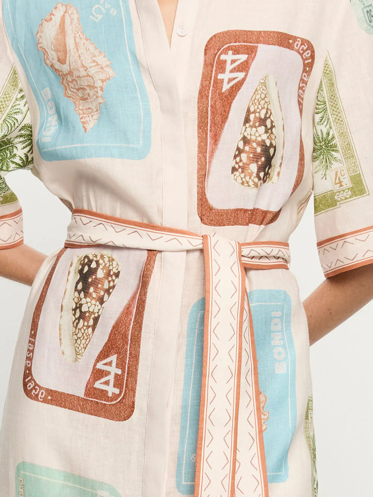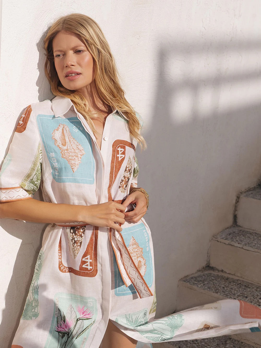Coastline is a vintage-inspired postcard print featuring coastal motifs in soft pastel tones on a soft neutral base. The Coastline Shirt Dress is crafted in a relaxed silhouette, featuring kimono-style sleeves and a button-through front. Complete with a removable waist tie, it offers the option to wear loose for effortless ease or cinched for a more defined shape. Elevate with heels for long lunches or evening celebrations.