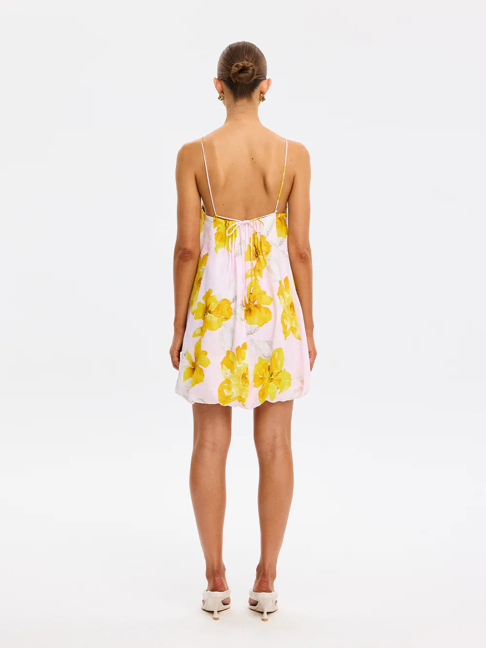 Francine is a soft pink base adorned with oversized golden-yellow florals. The Francine Bubble Mini Dress features a straight neckline with an adjustable back tie, thin straps and finished with a softly flared bubble hem for added shape and movement. Playful yet considered, it offers a modern take on a mini silhouette. Style with sandals for relaxed daytime dressing, or elevate with heels for an occasion-ready look.