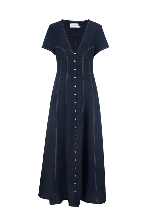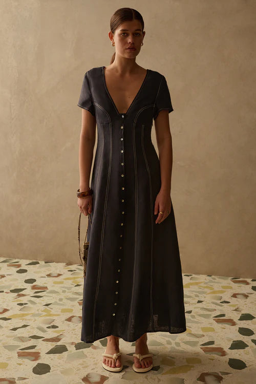 This stunning dress will have you turning heads with its sophistication and elegance. The Greta Dress has a structured yet comfortable silhouette with vertical panels that flare out around you. Featuring a contrast top stitching and shaped panel lines, this garment exudes quiet luxury.