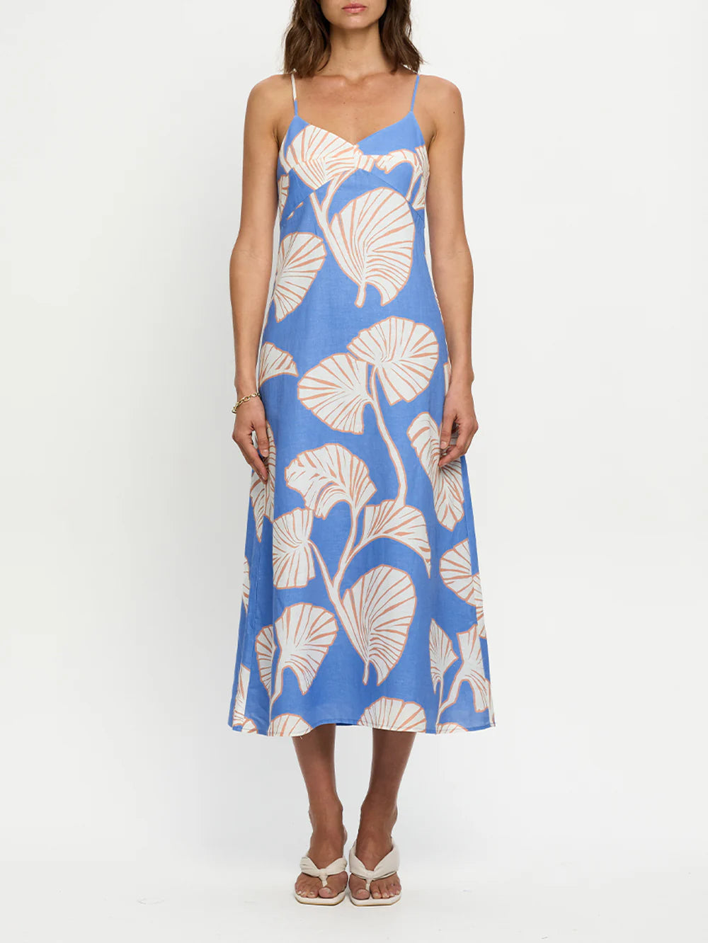 Ilana is oversized ivory and blush leaf motifs on a bold sky-blue base. The Ilana Midi Dress is a relaxed silhouette featuring adjustable thin straps, a softly flared hem and an invisible centre-back zip. Perfect for coastal getaways, long lunches or relaxed summer celebrations.