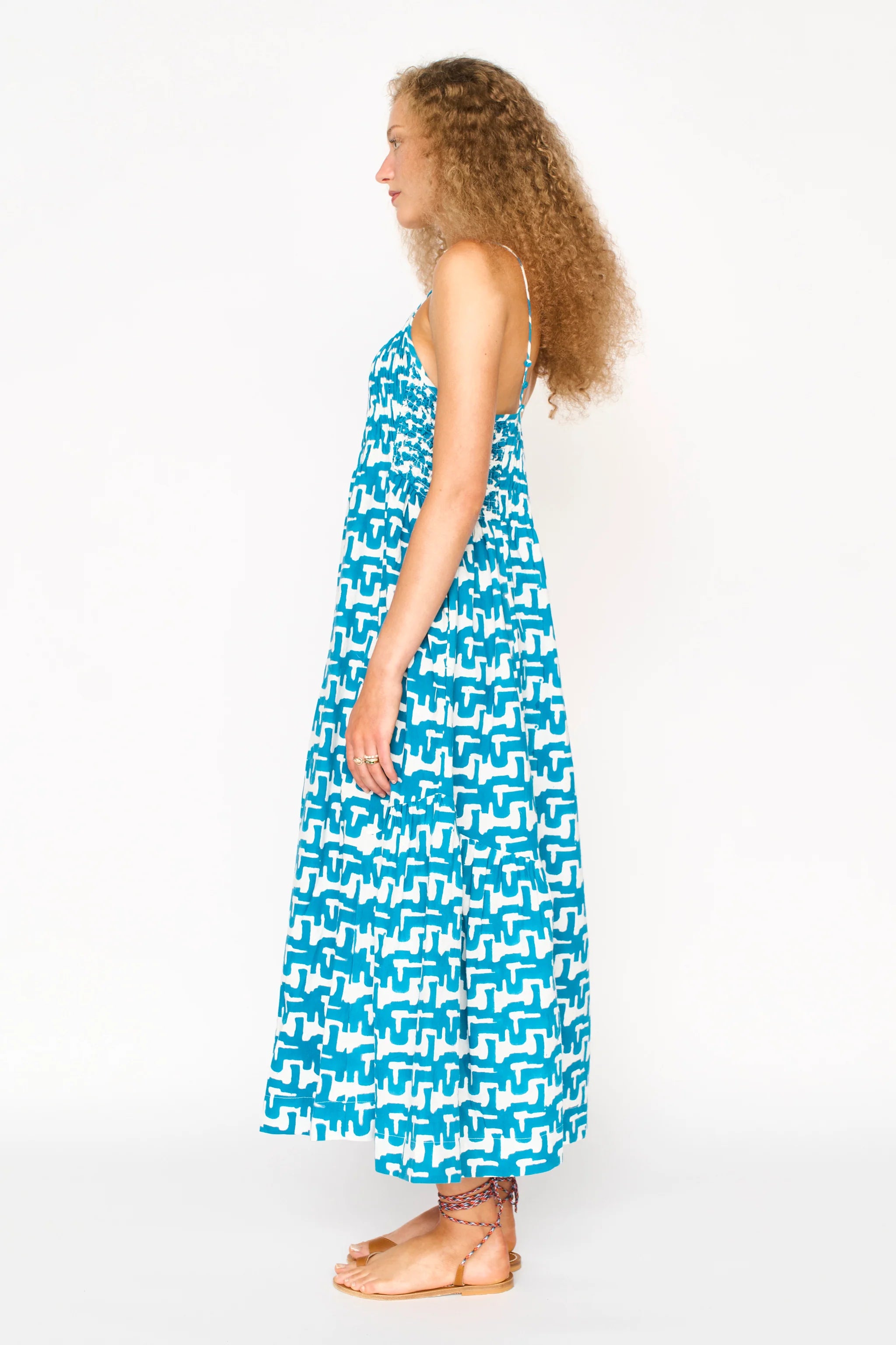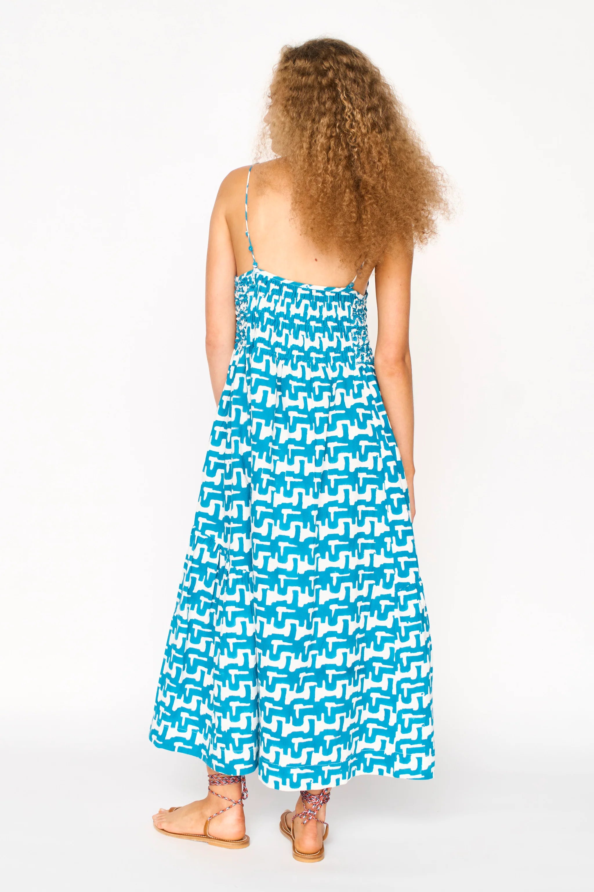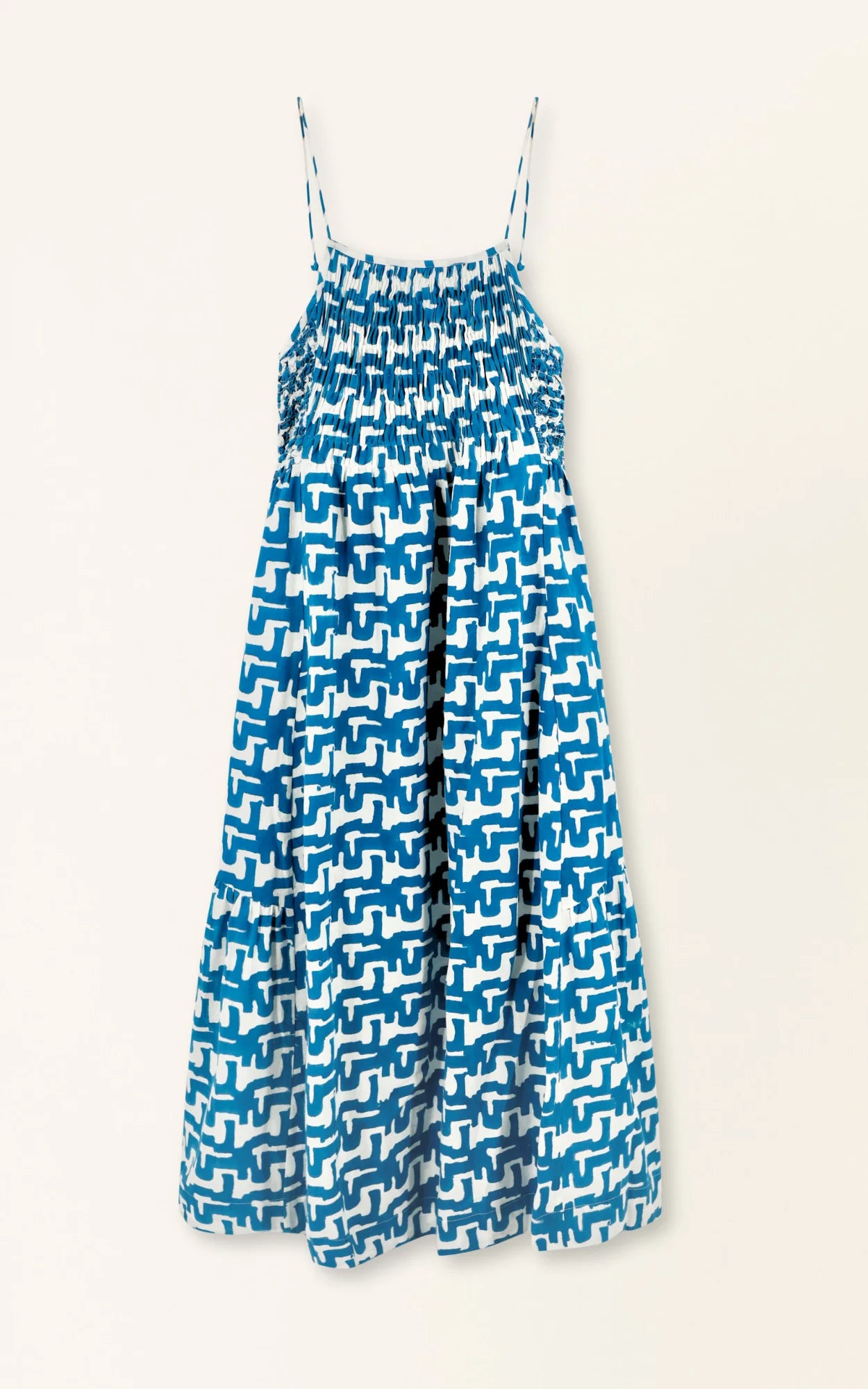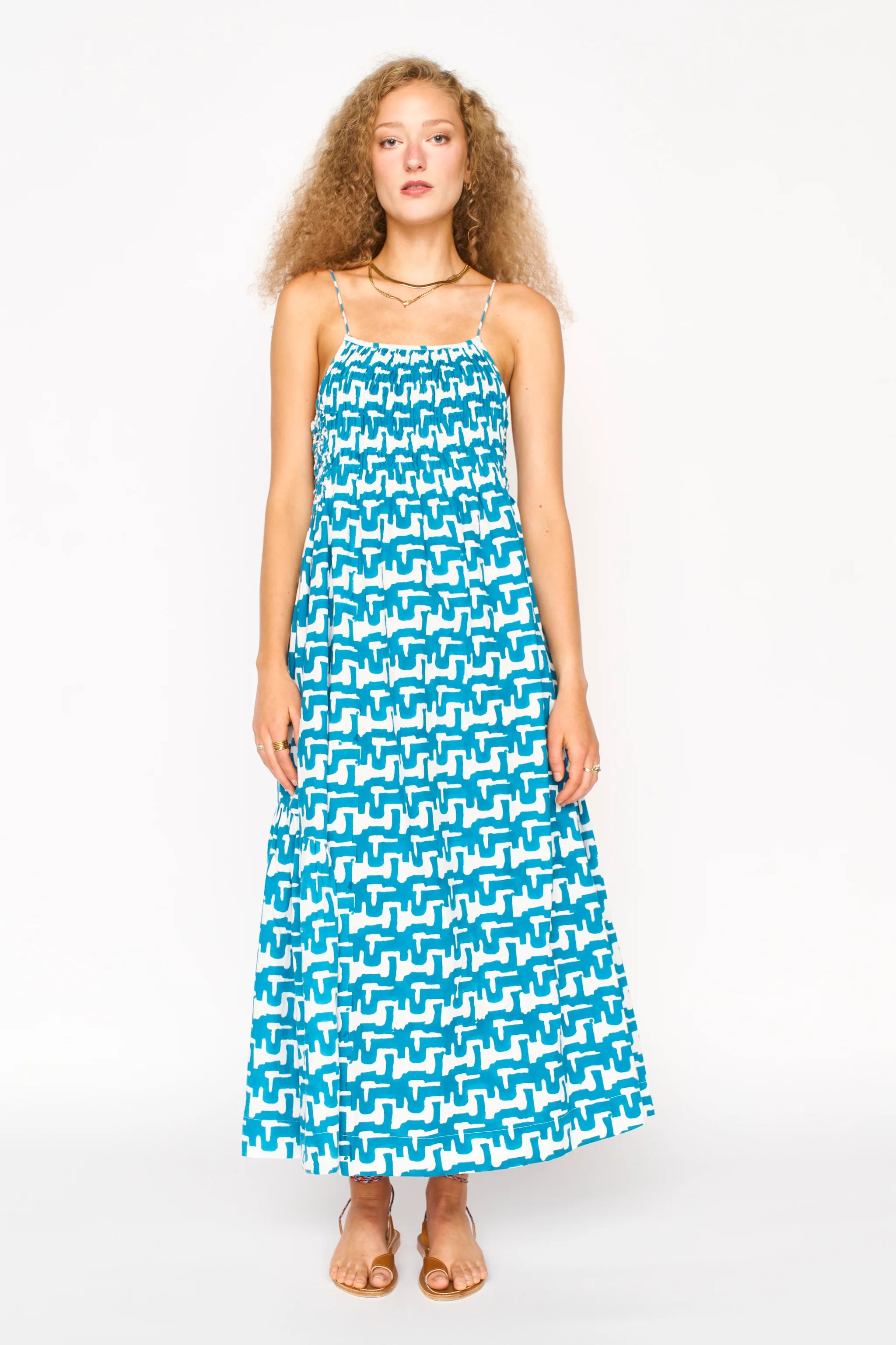 - Midi length sundress with smocked and cartridge pleat elastic bodice
