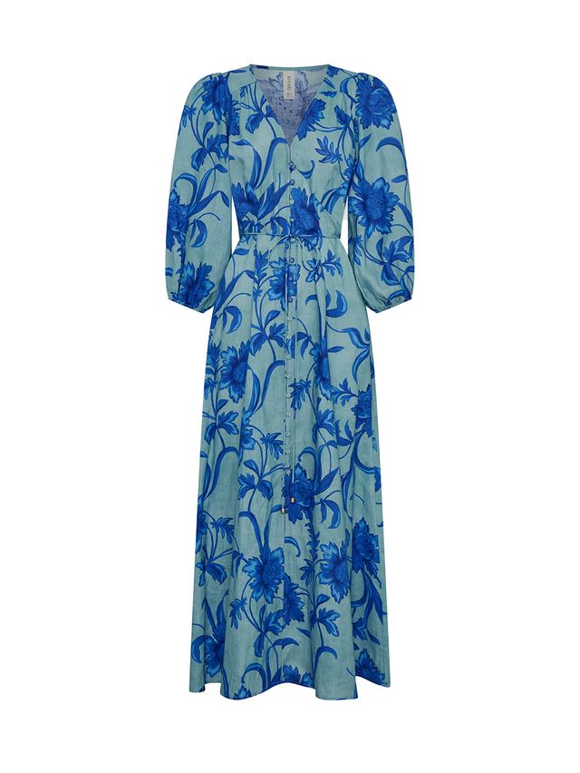 Juniper is bright blue florals set against a light teal base. The Juniper Maxi Dress features a V-neckline, blouson sleeves, button down front complete with a fixed waist tie