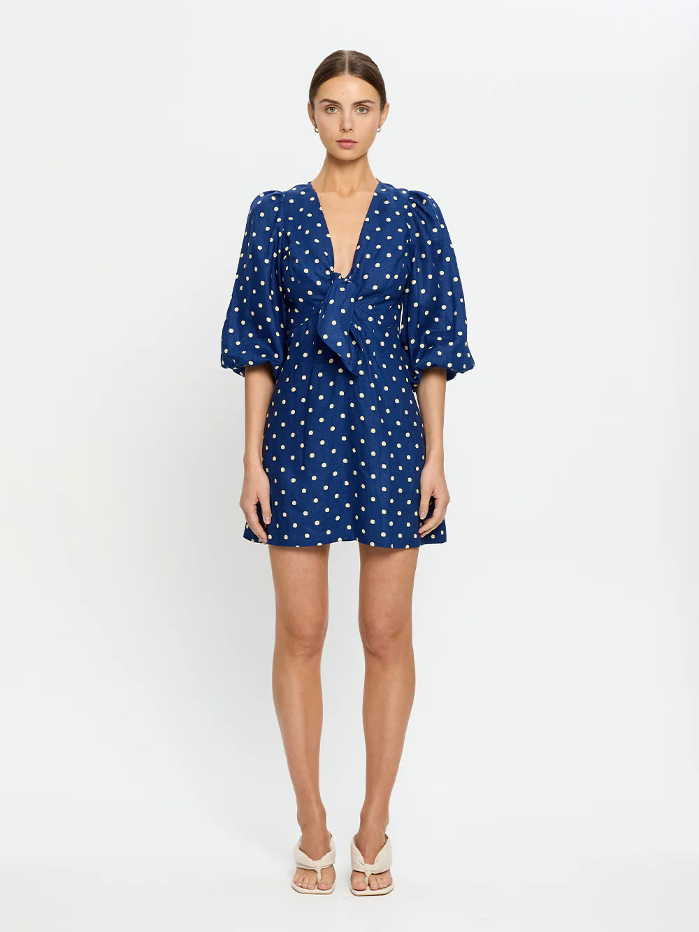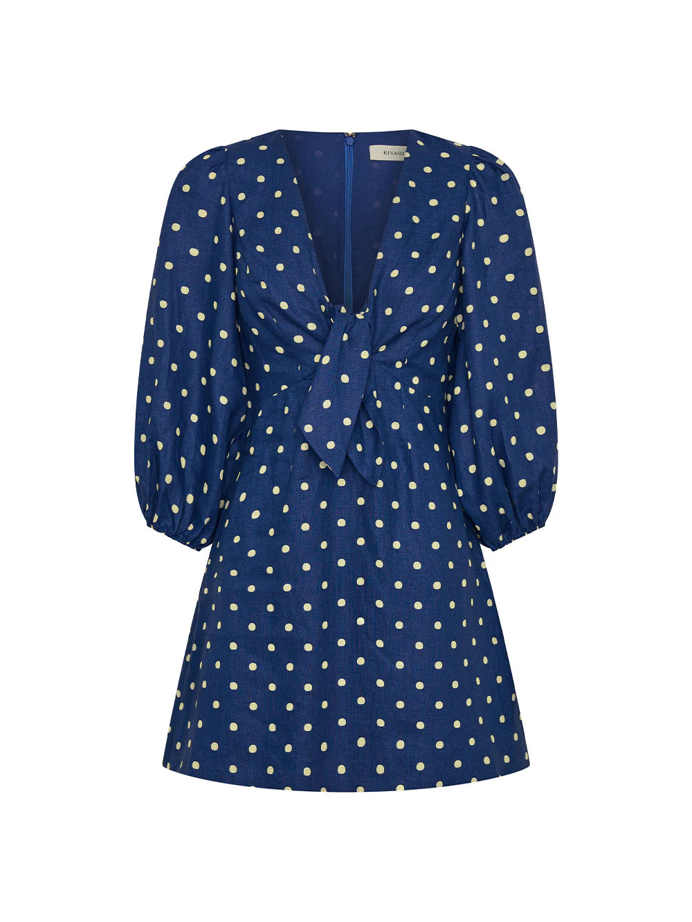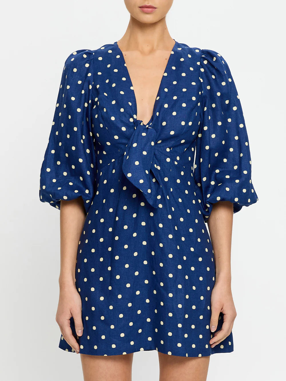 The Lily Mini Dress is crafted in a soft yellow polka dot on a navy blue base featuring a V-neckline, tie front bodice, complete with blouson sleeves. Please note this style runs small.