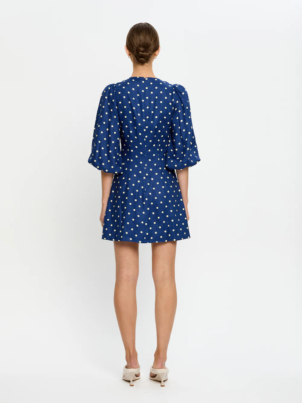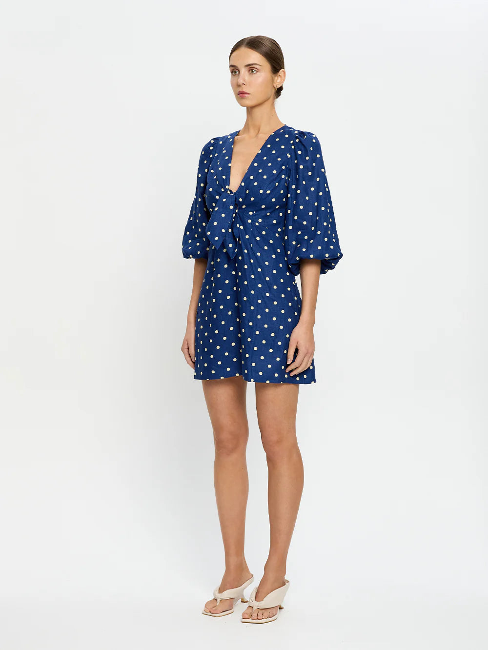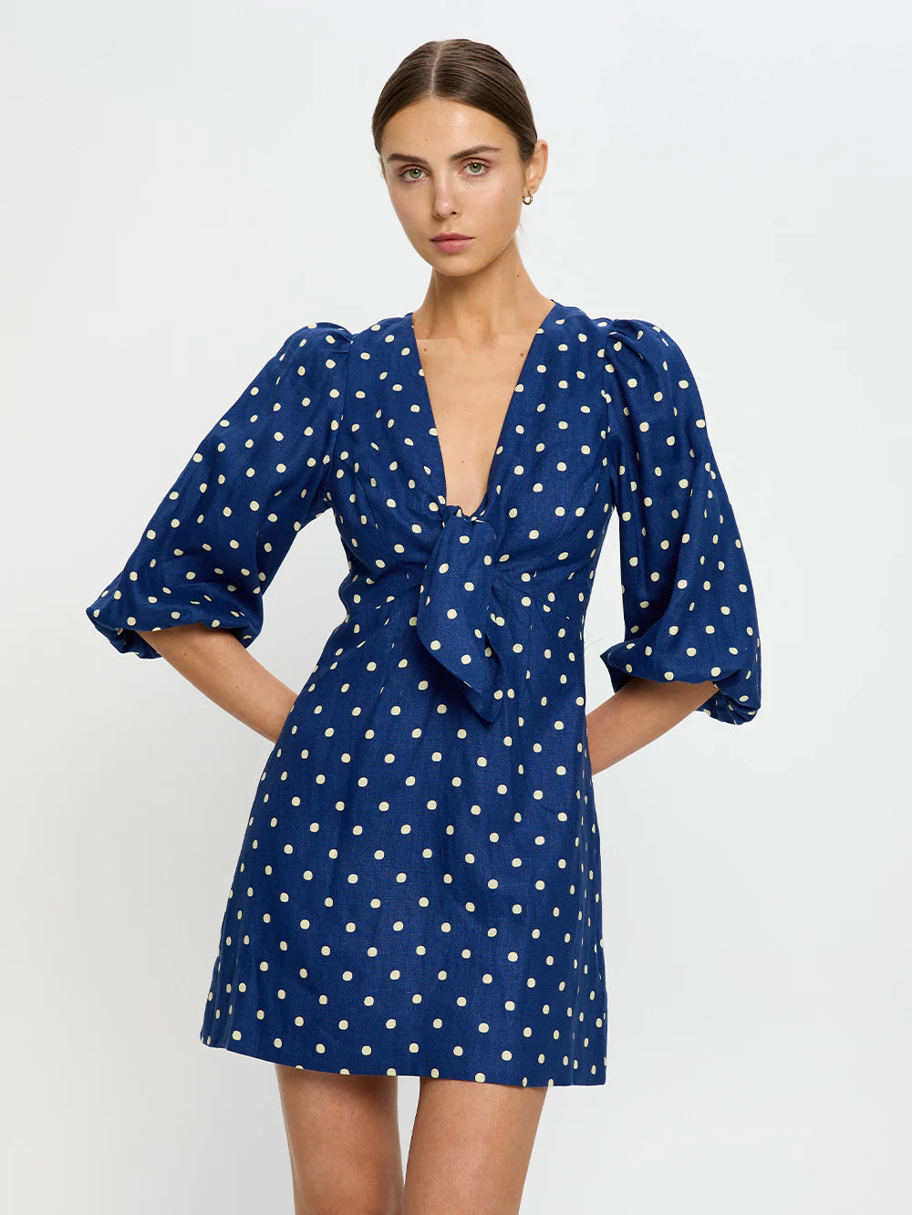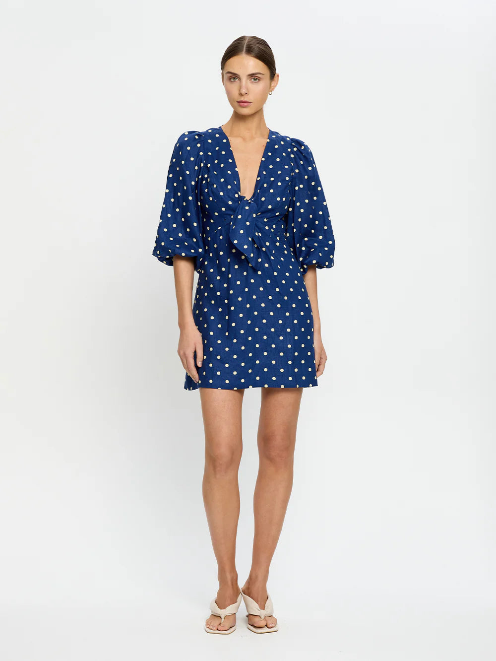 The Lily Mini Dress is crafted in a soft yellow polka dot on a navy blue base featuring a V-neckline, tie front bodice, complete with blouson sleeves. Please note this style runs small.