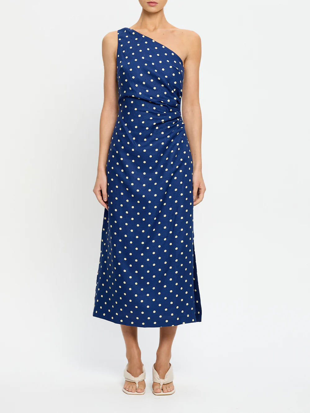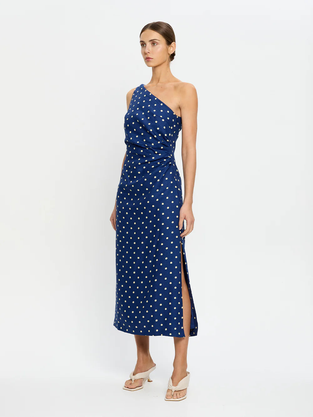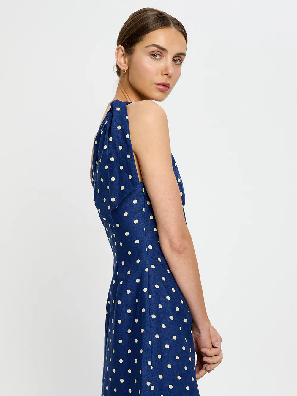 The Lily Midi Dress is crafted in a soft yellow polka dot on a navy blue base, featuring an asymmetrical neckline with adjustable tie, side split and complete with tuck details at the side waist.