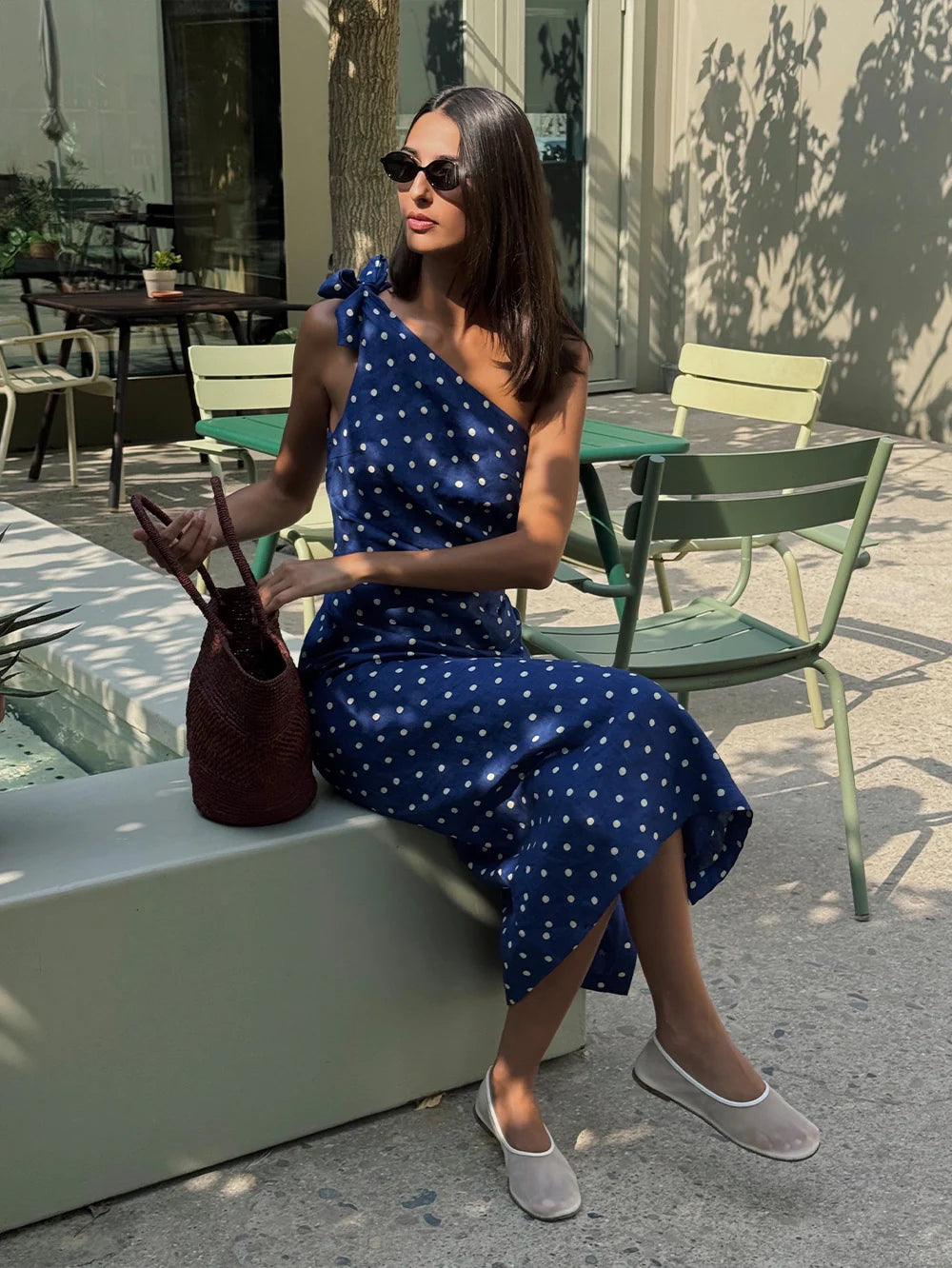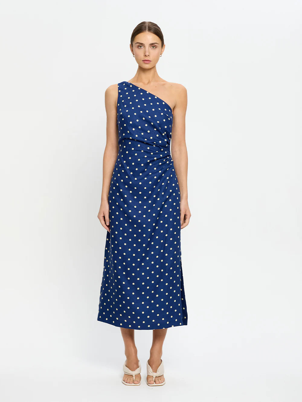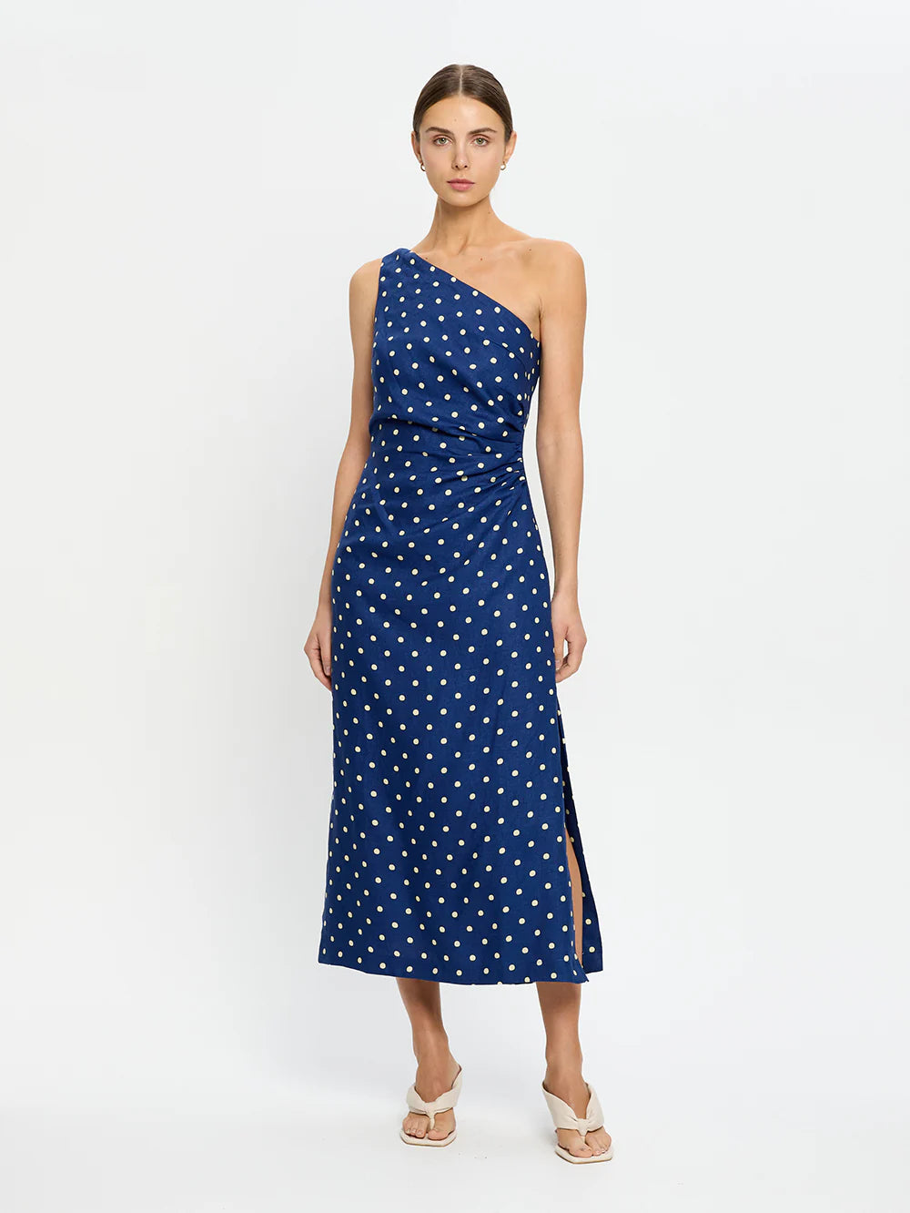 The Lily Midi Dress is crafted in a soft yellow polka dot on a navy blue base, featuring an asymmetrical neckline with adjustable tie, side split and complete with tuck details at the side waist.