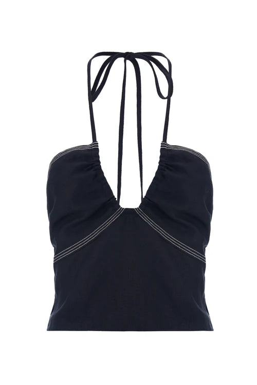 The Makena Top is made for vacations - totally beachy and effortless. With a halter neck, ruched bust and shirred back, this top is relaxed and comfortable while looking elevated. The custom gold shell hardware on the end of the ties also adds a special touch.