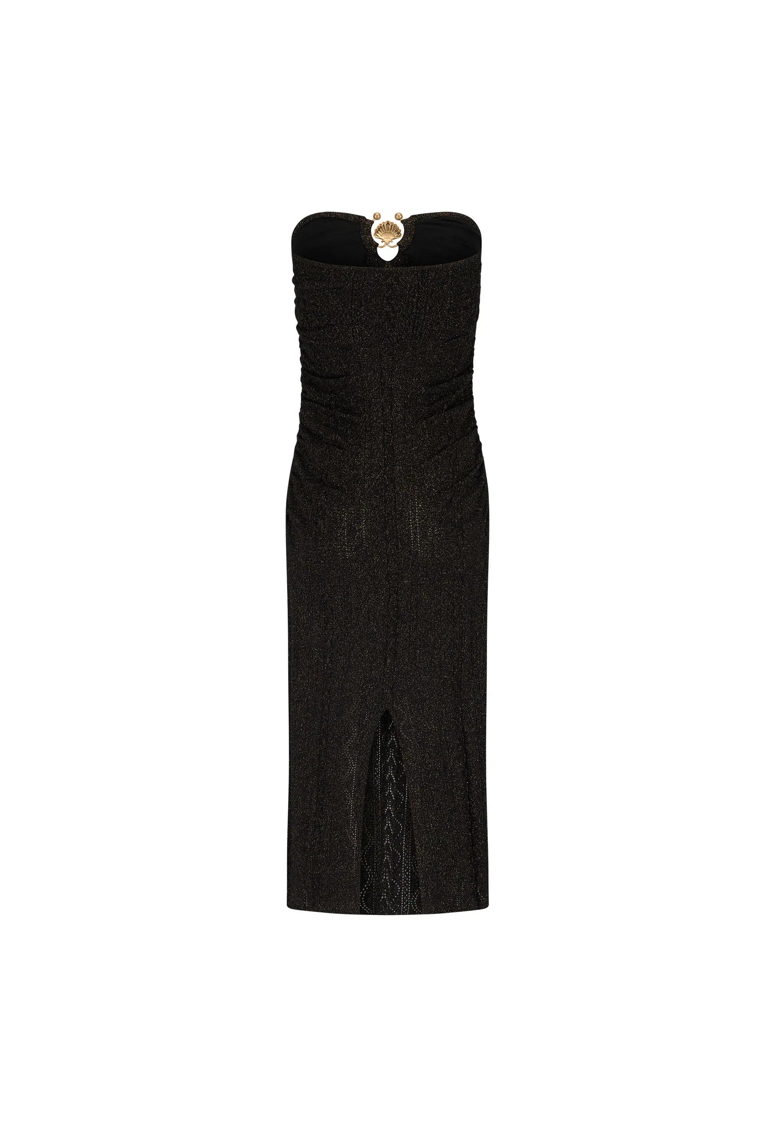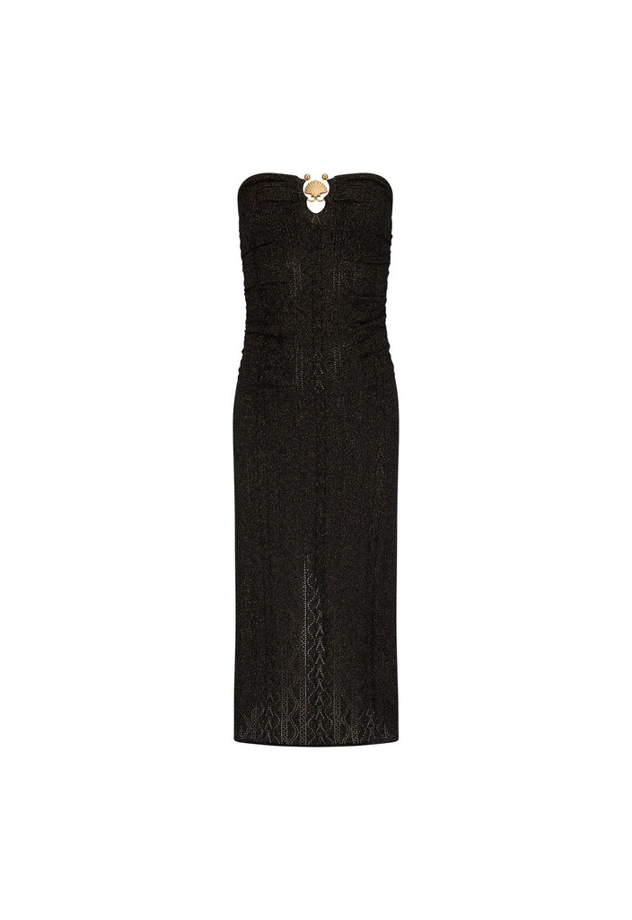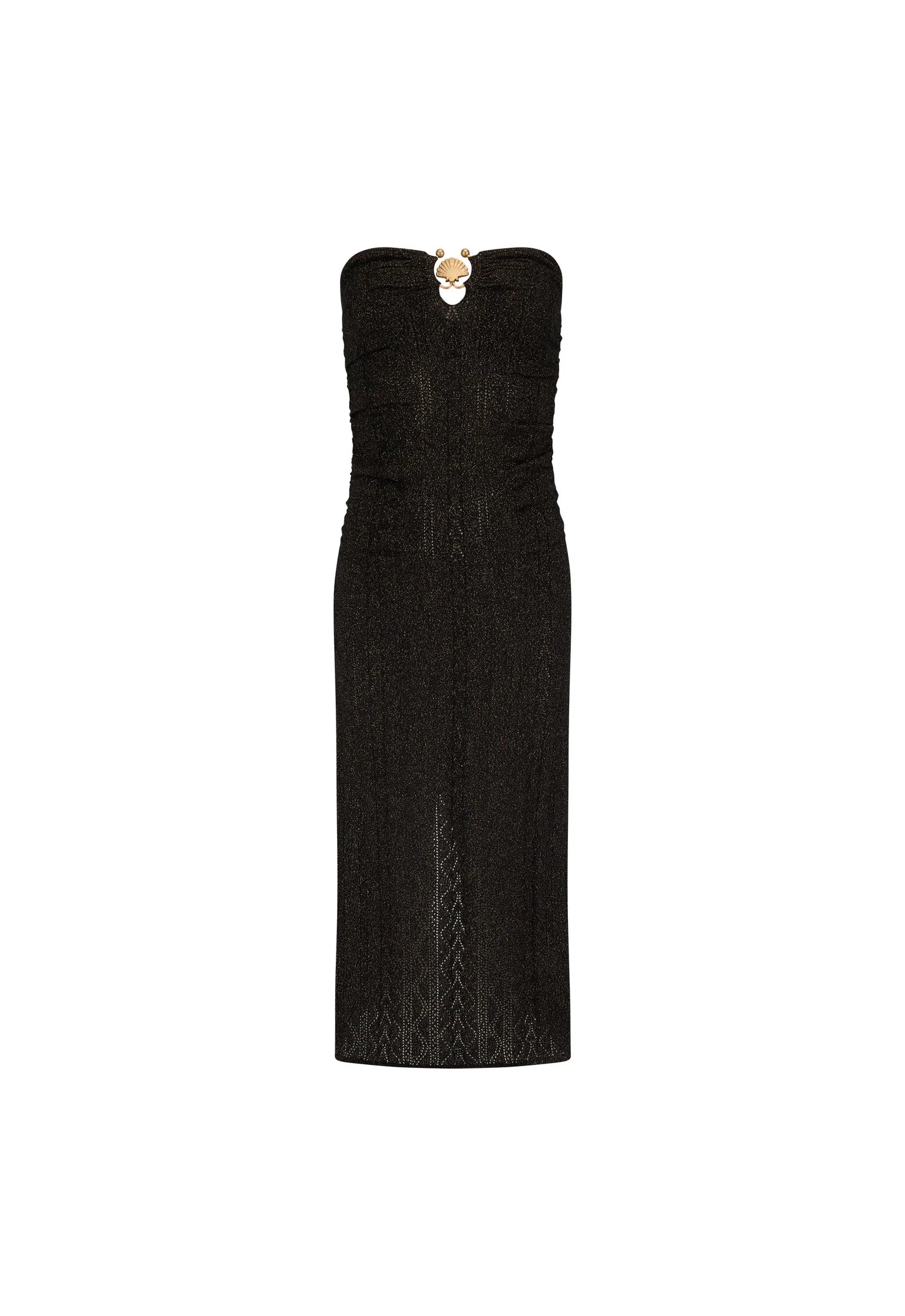 Unleash your inner risk-taker in The Moss Knit Midi Dress. Made from a true pointelle knit with metallic threading, this strapless dress features a flattering ruched design and a high center back split. The custom metal shell hardware at the bust adds a hint of daring and adventure. Available in the bold color Onyx and perfect for and holiday celebration in your calendar.