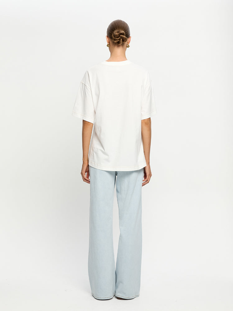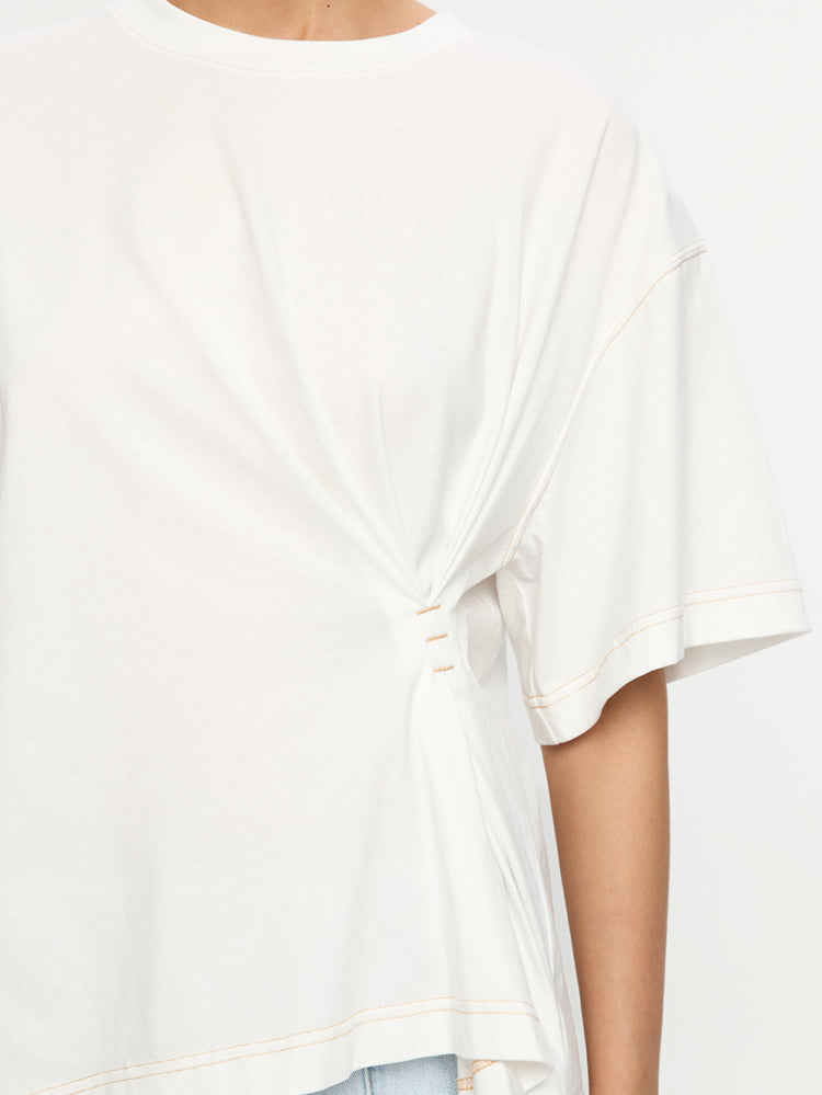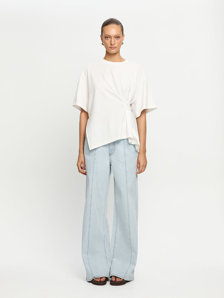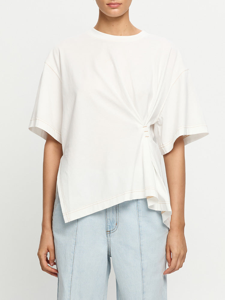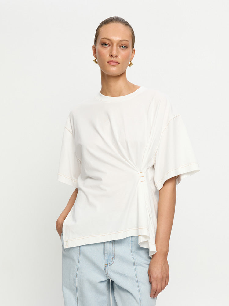 The Vera Asymmetrical Tee crafted in 100% Organic Cotton is an oversized, boxy silhouette featuring short sleeves, long side splits, complete with a gathered pleat detail with contrast brown stitching that adds subtle shape. Soft and breathable, it offers an effortless approach to everyday dressing. Style with relaxed denim or tailored pants for easy daytime wear, or layer over a slip skirt for a more considered, modern look.
