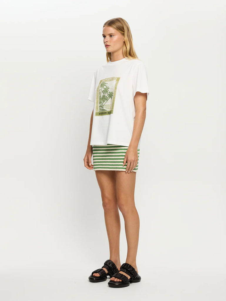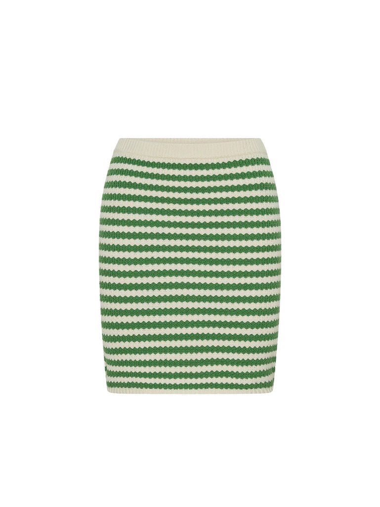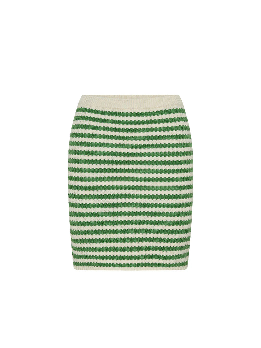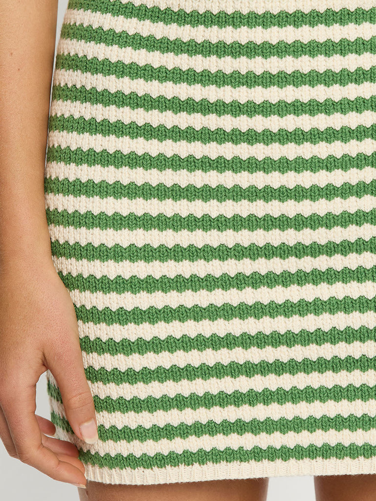 The Corinne Knit Mini Skirt is crafted in a soft green and cream stripe knit, featuring an elasticated waistband and a ribbed hem for subtle structure and comfort. Style with our Tallulah One Shoulder Tank and slides for everyday ease.