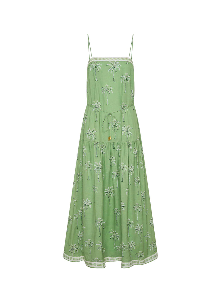 Kaelia is delicate ivory palms scattered across a soft green base. The Kaelia Strappy Maxi Dress is a relaxed silhouette featuring a straight neckline and fine shoulder straps, finished with a contrast border at the neckline and hem. Designed with a dropped waist and removable tie for versatile styling, it drapes softly through the body, balancing ease with refined detail. Style with slides relaxed afternoons, or elevate with heels for balmy evenings.