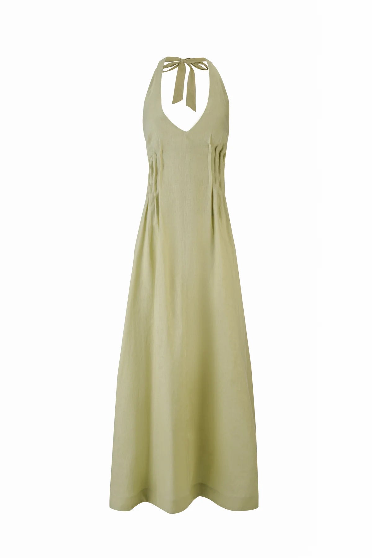 As sweet as a sunny summer day, The Birdie Dress is a romantic style featuring a flattering v-neckline, intricate pleated bodice and full skirt with flounce. The halter neckline and elasticated back make this easy to wear from beach to bar.